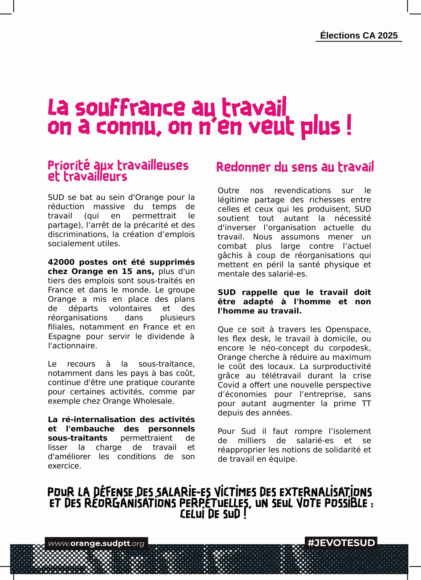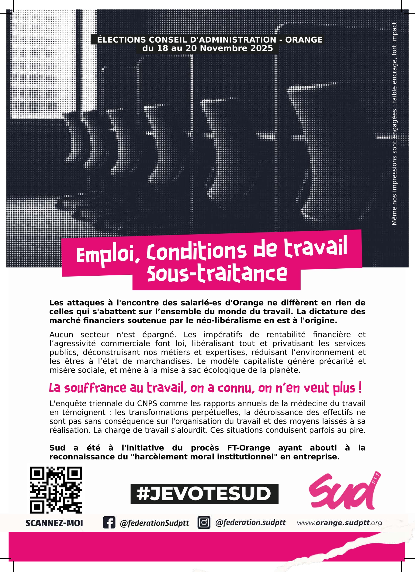 SUD se bat au sein d’Orange pour la réduction massive du temps de travail ( qui en permettrait le partage), l ‘arrêt de la précarité et des discriminations, la créations d’emplois socialement utiles.